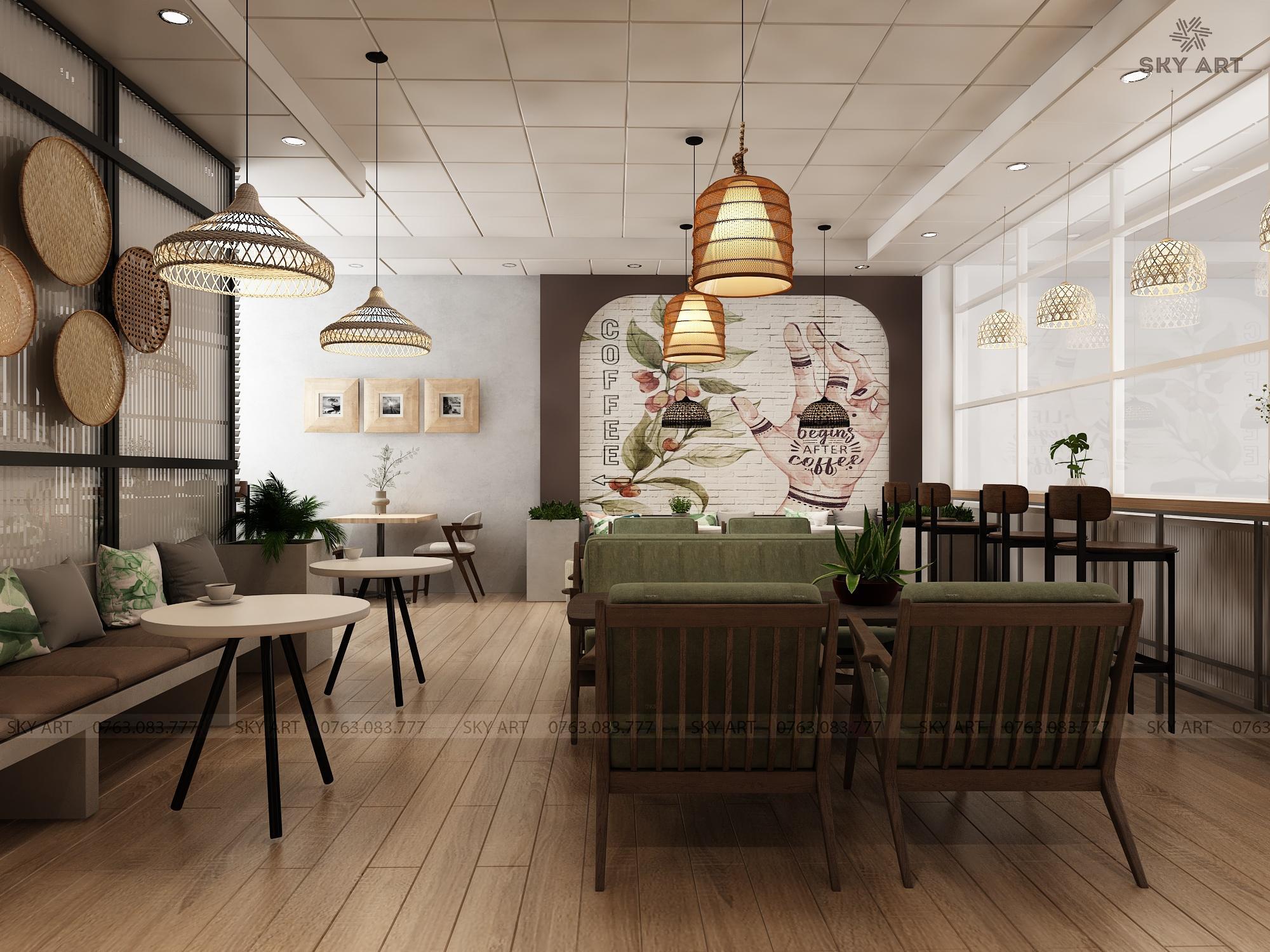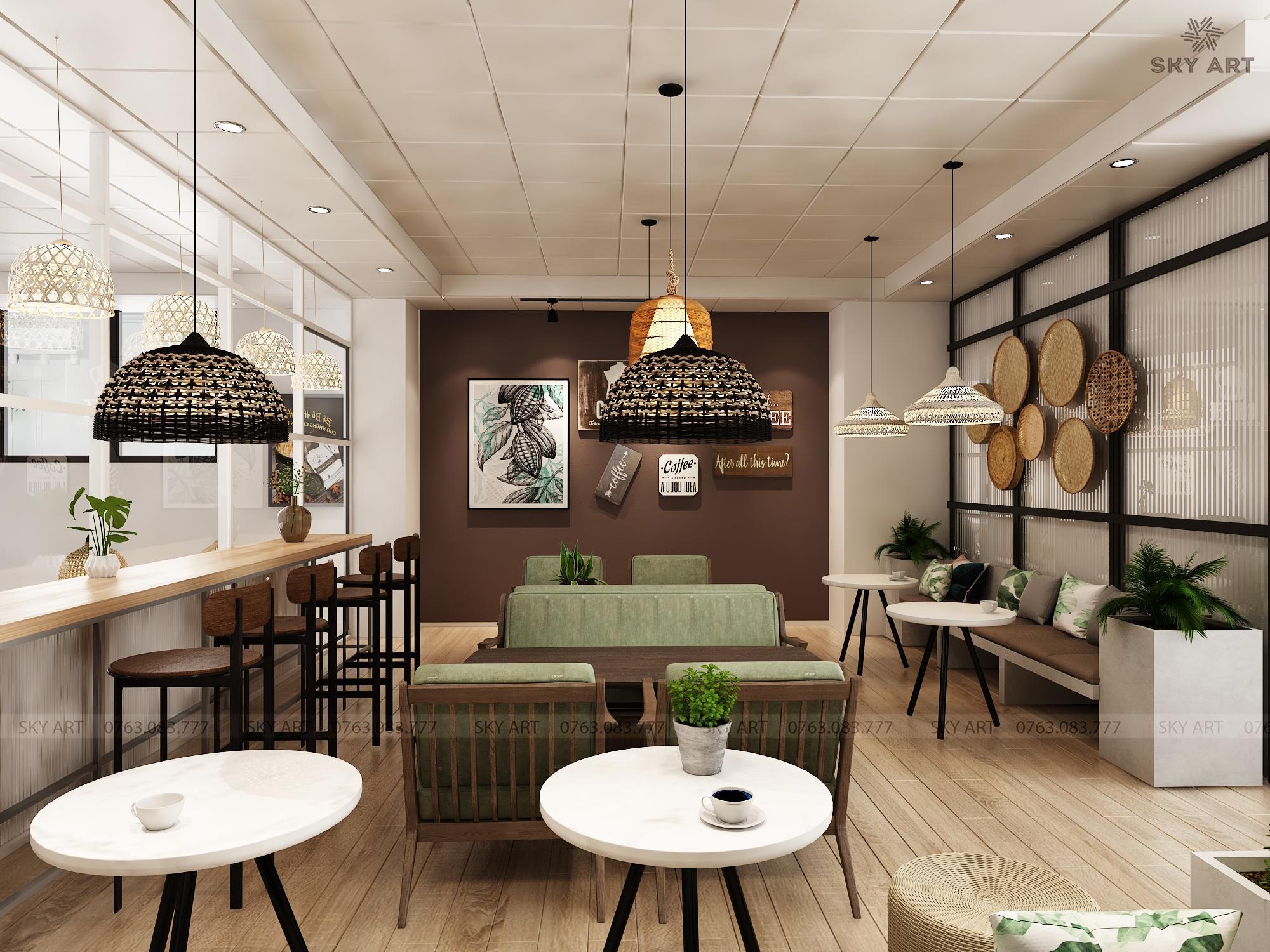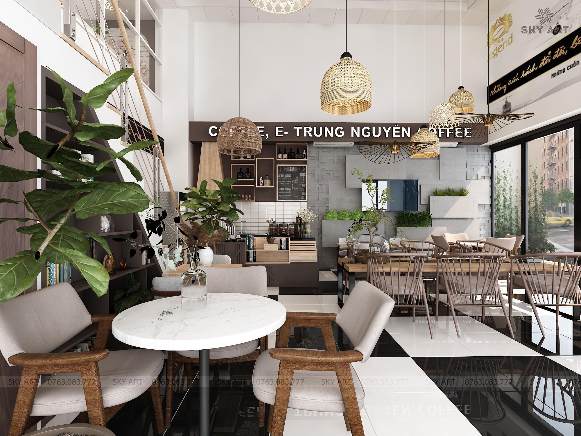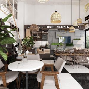 Thiết kế thi công nội thất trọn gói E-coffee Trung Nguyên tại Swan Park, KĐT Đông Sài Gòn, Nhơn Trạch, Đồng Nai. SKY ART đã biến tấu nhẹ trong thiết kế thi công nội thất quán cafe góp phần tạo điểm khác biệt cho mô hình E-Coffee này. Nội thất hiện đại tinh tế với điểm nhấn từ các chất liệu gỗ, mây tre đan đậm chất Việt.