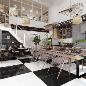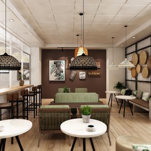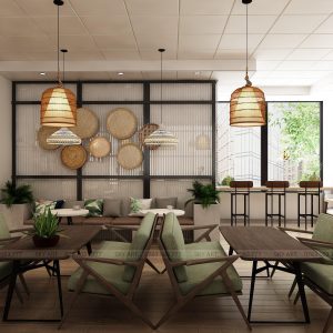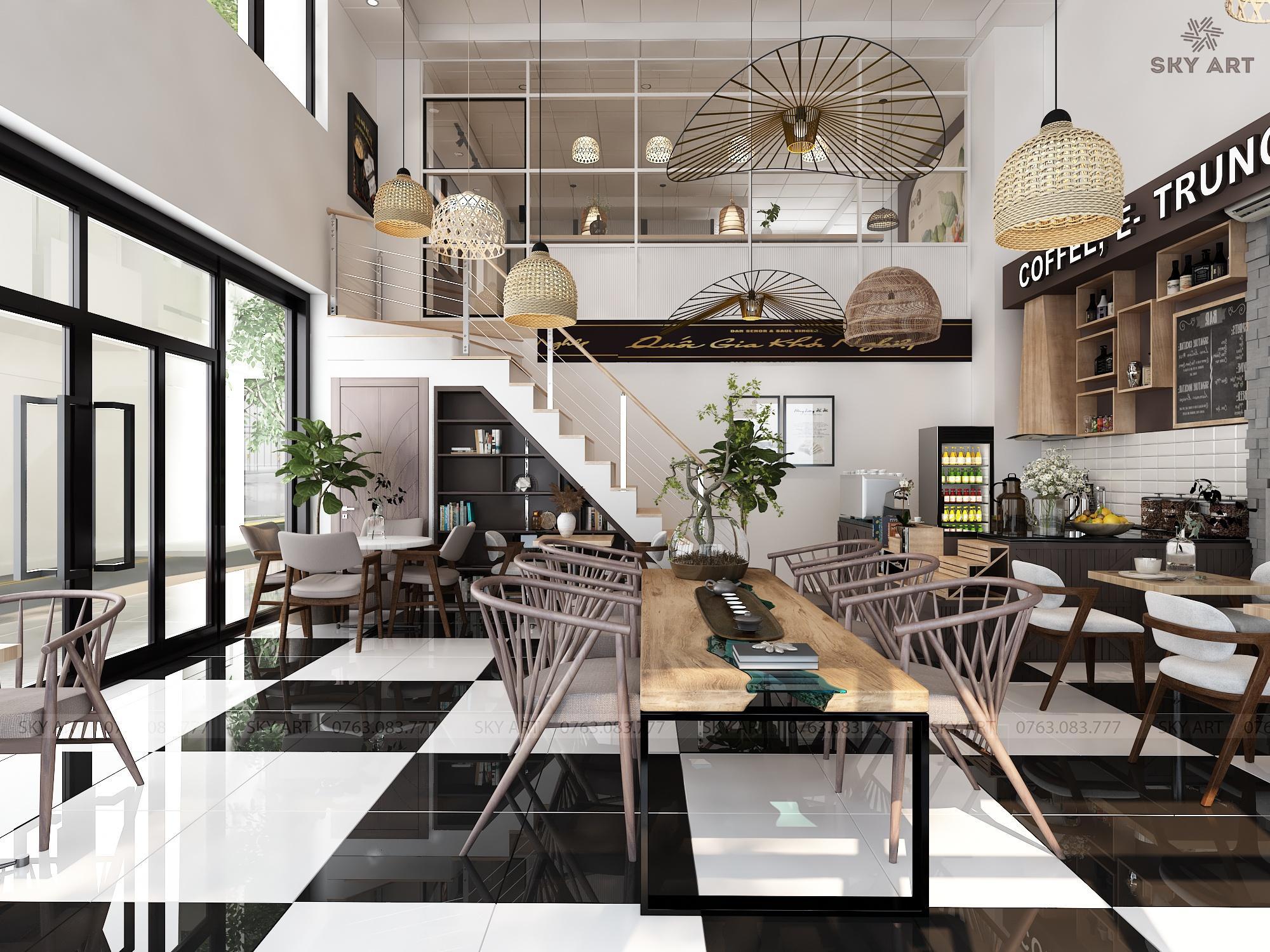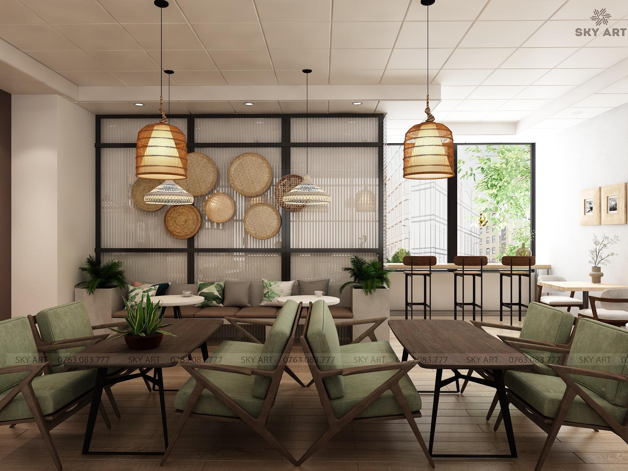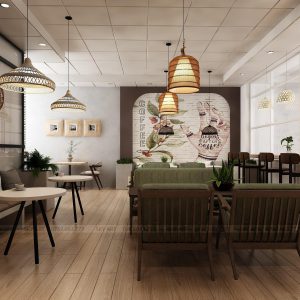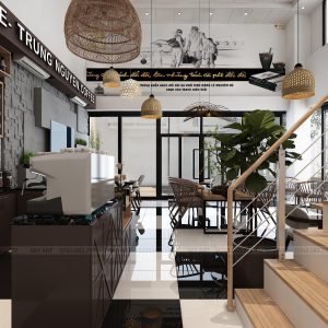 Thiết kế thi công nội thất trọn gói E-coffee Trung Nguyên tại Swan Park, KĐT Đông Sài Gòn, Nhơn Trạch, Đồng Nai. SKY ART đã biến tấu nhẹ trong thiết kế thi công nội thất quán cafe góp phần tạo điểm khác biệt cho mô hình E-Coffee này. Nội thất hiện đại tinh tế với điểm nhấn từ các chất liệu gỗ, mây tre đan đậm chất Việt.