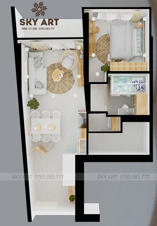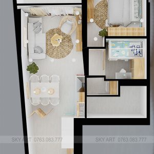 Công năng: 1 phòng khách, 1 phòng bếp, 1 + 1 phòng ngủ
