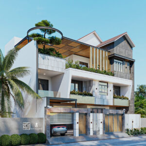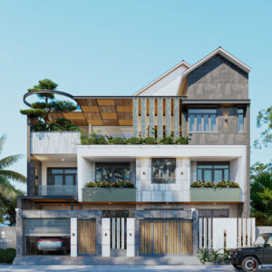 Kiến trúc công trình mang phong cách hiện đại, tinh giản trong hình khối nhưng giàu cảm xúc trong cách tổ chức không gian. Hệ ban công, mái đua và khoảng đệm kiến trúc giúp ngôi nhà thích ứng tốt với điều kiện khí hậu, đồng thời mang lại sự thông thoáng và dễ chịu cho mọi thế hệ cùng sinh sống.